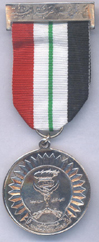 Green Middle stripes 2 mm Instituted: 1987 Awarded: Grades: 1 Class, to commemorate the 25th anniversary of the September 26, 1962 revolution. You can see the hand held torch and the open wings of the Yemen eagle with Arabic inscriptions on the Obverse and the medal title on the Reverse Price: $ 60 Rare |