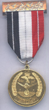 Green Middle stripes 2 mm Instituted: 1987 Awarded: Grades: 1 Class, to commemorate the 25th anniversary of the September 26, 1962 revolution. You can see the hand held torch and the open wings of the Yemen eagle with Arabic inscriptions on the Obverse and the medal title on the Reverse Price: $ 60 Rare |